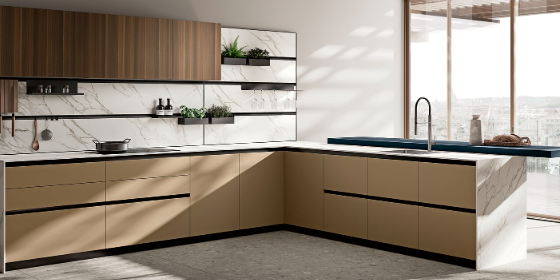 Una cucina moderna si caratterizza per linee pulite, spazi ben organizzati e materiali innovativi. Un’isola centrale in marmo bianco come questa può fungere sia da piano di preparazione che da zona per la colazione, con sgabelli moderni.